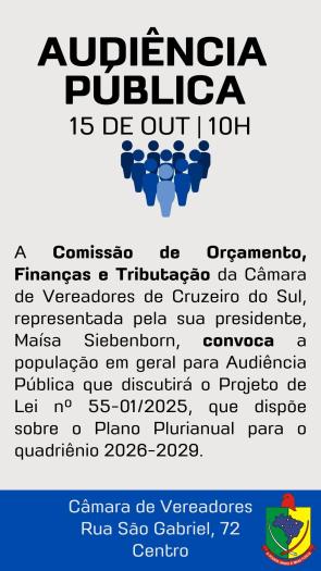 A Comissão de Orçamento, Finanças e Tributação da Câmara de Vereadores de Cruzeiro do Sul, representada por sua presidente, vereadora Maísa Siebenborn, convida toda a população a participar da audiência pública que discutirá o Projeto de Lei nº 055-01/2025, o qual dispõe sobre o Plano Plurianual (PPA) para o quadriênio 2026–2029.