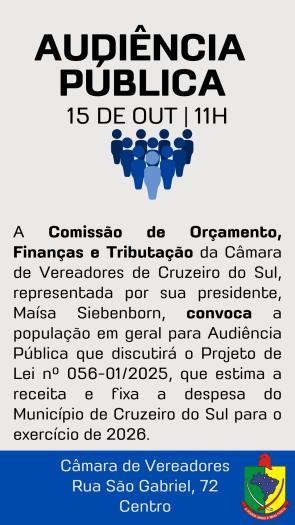 A Comissão de Orçamento, Finanças e Tributação da Câmara de Vereadores de Cruzeiro do Sul, presidida pela vereadora Maísa Siebenborn, convida toda a comunidade para participar da Audiência Pública que vai discutir o Projeto de Lei nº 056-01/2025 — o qual estima a receita e fixa a despesa do Município para o ano de 2026.
